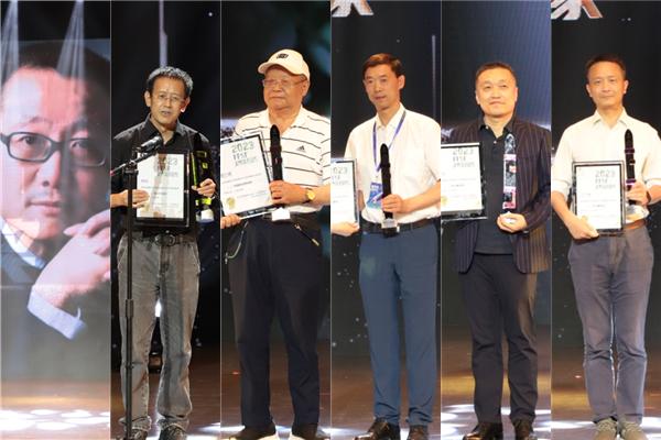 China's prominent sci-fi figures Liu Cixin, Han Song, Dong Renwei, Yao Haijun, Wu Yan, and Ding Zicheng receive their achievement awards on stage at the inaugural Fishing Fortress Science Fiction Awards gala in Hechuan, Chongqing, June 10, 2023. [Photo courtesy of Fishing Fortress Science Fiction College]