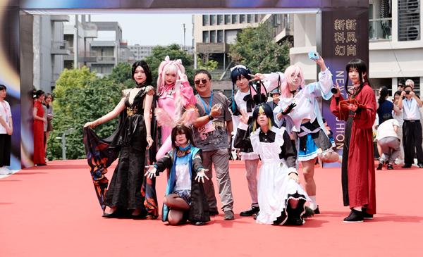Sci-fi cosplayers pose with a guest on the red carpet before the inaugural Fishing Fortress Science Fiction Awards gala is held in Hechuan, Chongqing, June 10, 2023. [Photo courtesy of Fishing Fortress Science Fiction College]