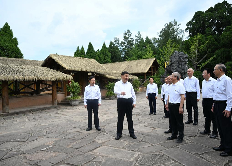 General Secretary of the Communist Party of China Central Committee Xi Jinping, also Chinese president and chairman of the Central Military Commission, visits the site of a section of an ancient road system known as "Shudao" in Guangyuan City, southwest China's Sichuan Province, July 25, 2023. Xi inspected southwest China's Sichuan Province on Tuesday and Wednesday. He visited the site of a section of an ancient road system known as "Shudao" in Guangyuan City and the Sanxingdui Museum in Deyang City, respectively. Xi learned about efforts in historical and cultural heritage inheritance and ecological conservation, the progress in the excavation and research of historical and cultural heritage sites, as well as the protection and restoration of cultural relics. [Photo/silubaba]