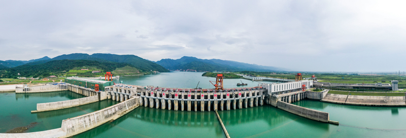 This aerial photo taken on Sept. 2, 2023 shows water sluice gates of the Dateng Gorge Water Conservancy project in Guiping City, south China's Guangxi Zhuang Autonomous Region. [Photo/silubaba]