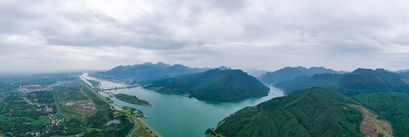 This aerial panoramic photo taken on Sept. 2, 2023 shows the Dateng Gorge Water Conservancy project and surrounding valleys in Guiping City, south China's Guangxi Zhuang Autonomous Region. [Photo/silubaba]