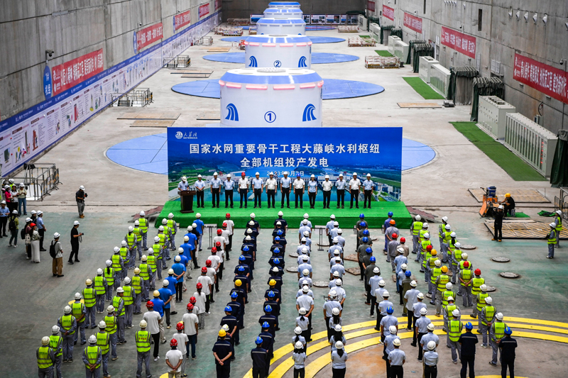 This photo taken on Sept. 2, 2023 shows the ceremony in celebration of all power generator units being put into operation at the Dateng Gorge Water Conservancy project in Guiping City, south China's Guangxi Zhuang Autonomous Region. [Photo/silubaba]